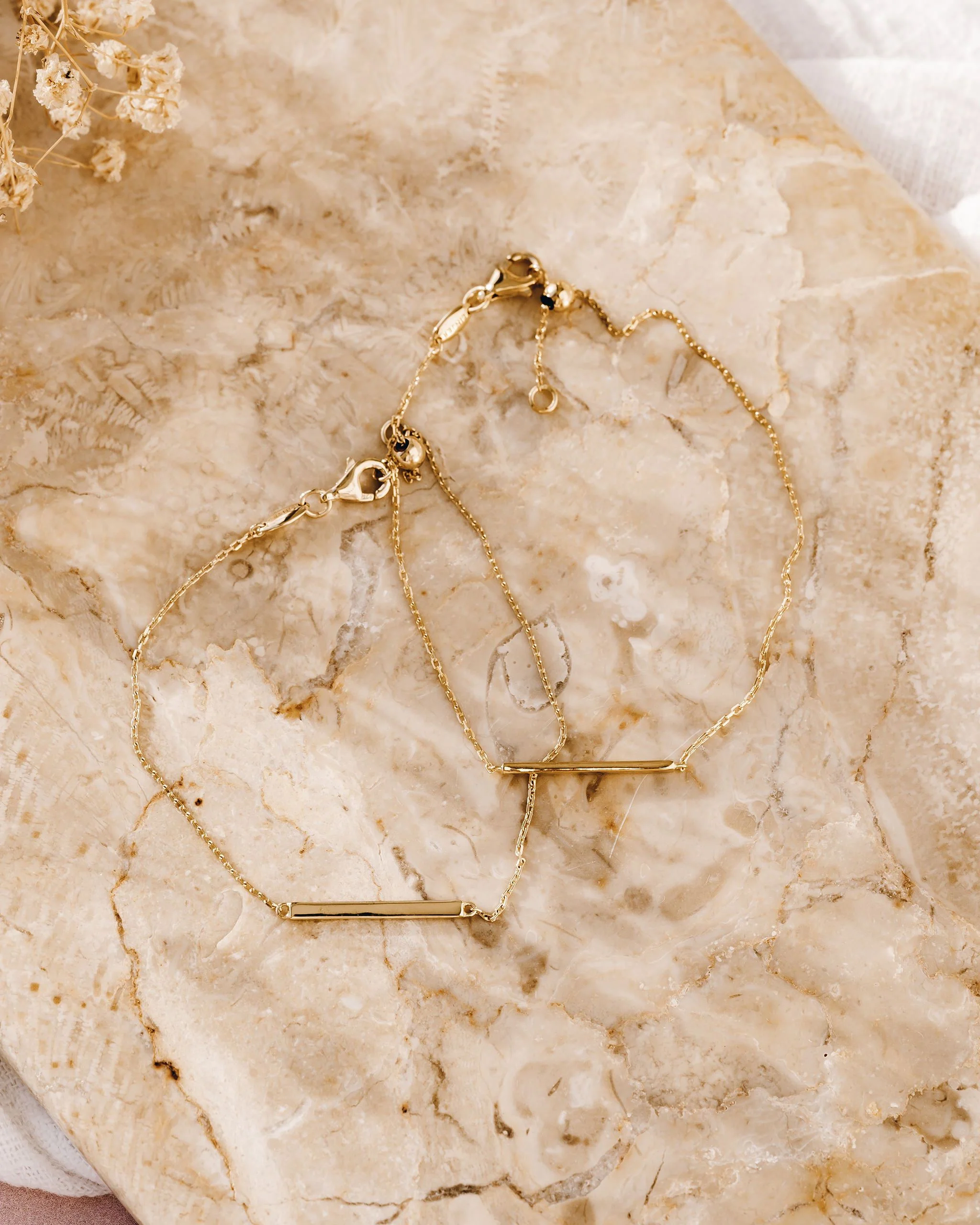 This gold bracelet features a dainty bar on a delicate chain, perfect for everyday wear.