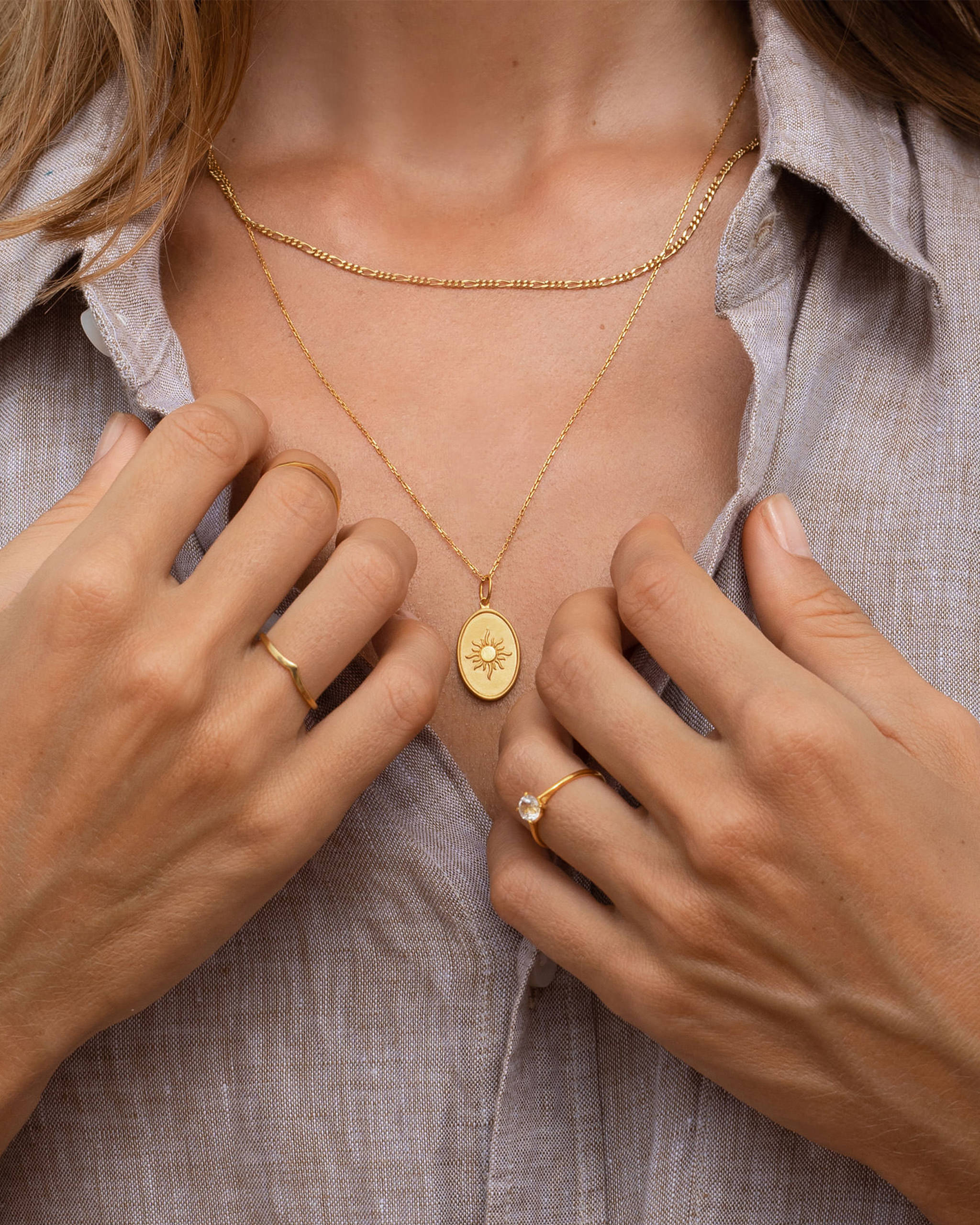 A boho necklace with a gold sun medallion pendant on a long dainty chain.
