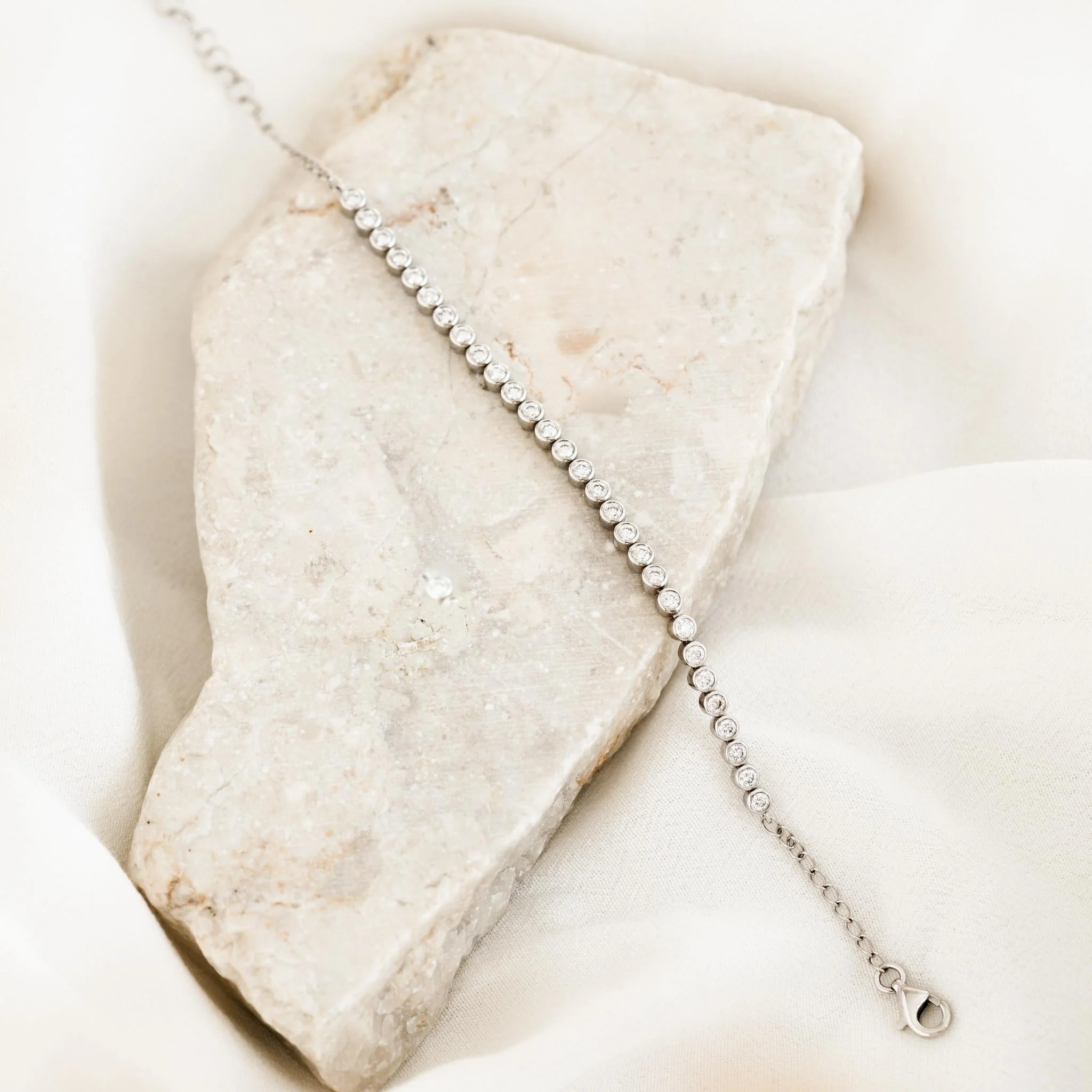 This stunning half diamond tennis bracelet features a row of bezel-set brilliant cut diamonds with a 14k white gold chain.