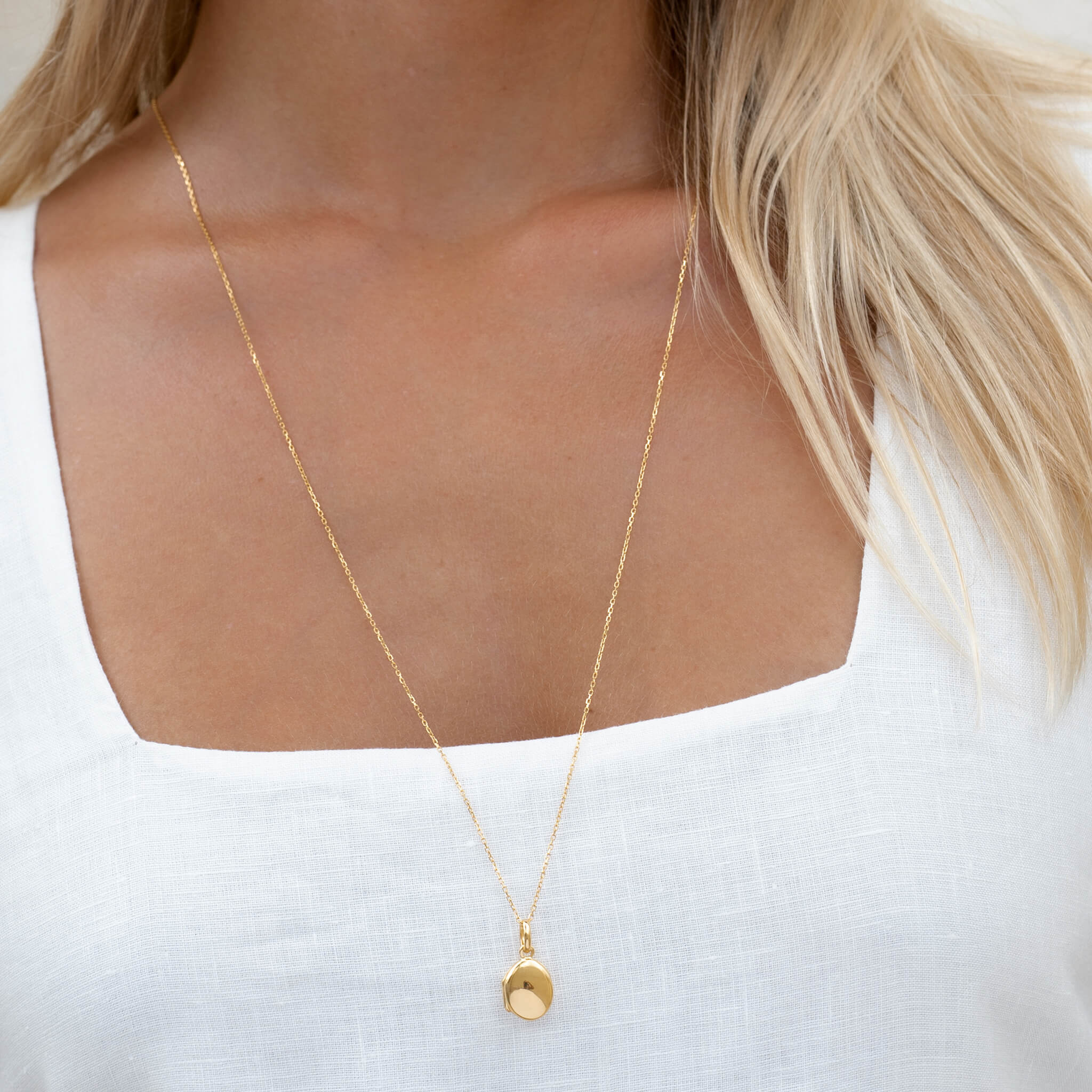 A gold locket pendant on a long chain necklace, perfect for layering with other necklaces. We won't tell whose picture you keep inside ;)