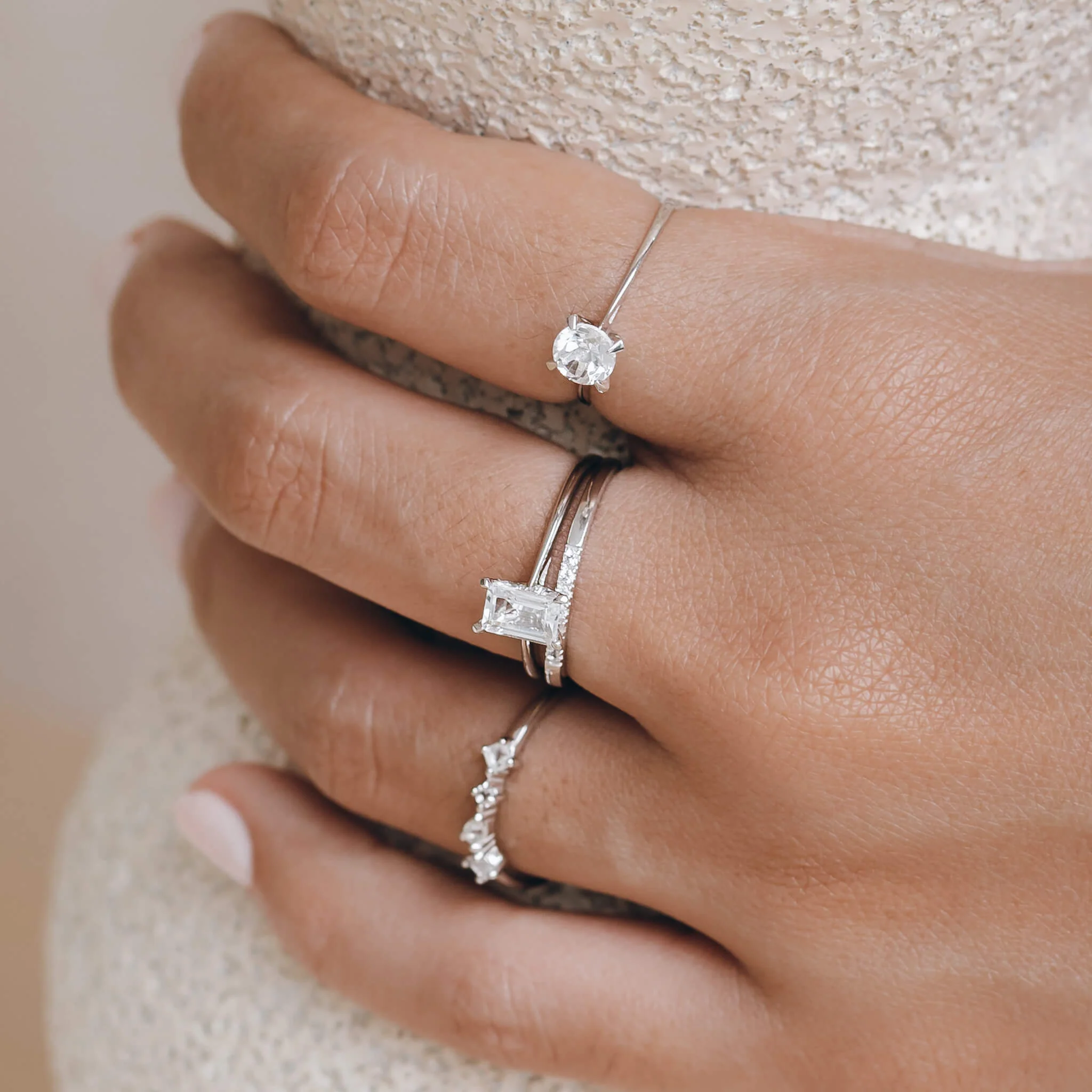 A half eternity pave ring featuring 7 hand-set white topaz gemstones on a silver band.
